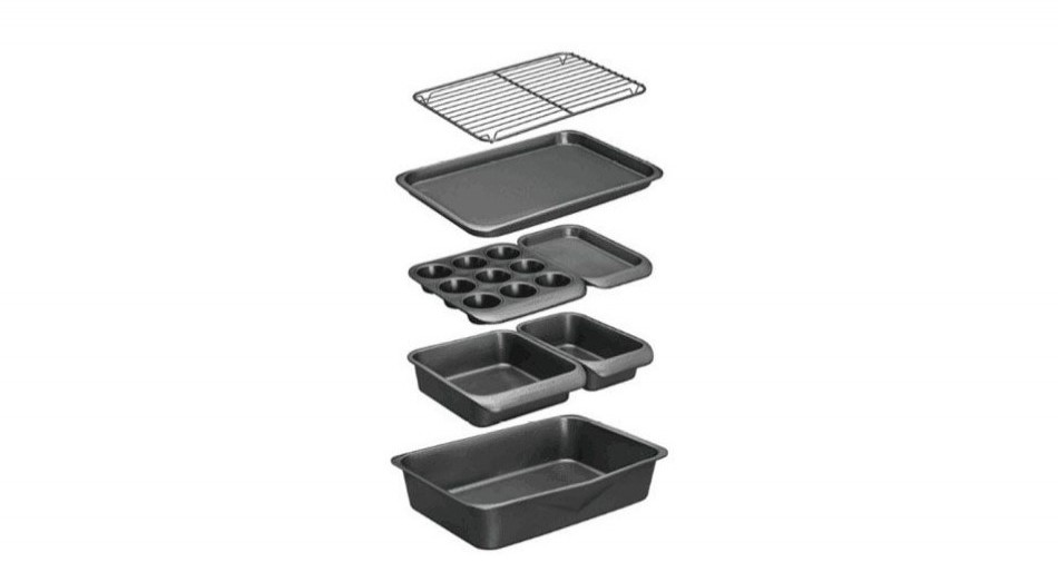 Includes: 1 Rack, 1 Tray, 1 3x3 Muffin Pan, 1 Small Side Tray, 1 Square Pan, 1 Small Side Pan, 1 Baking Pan